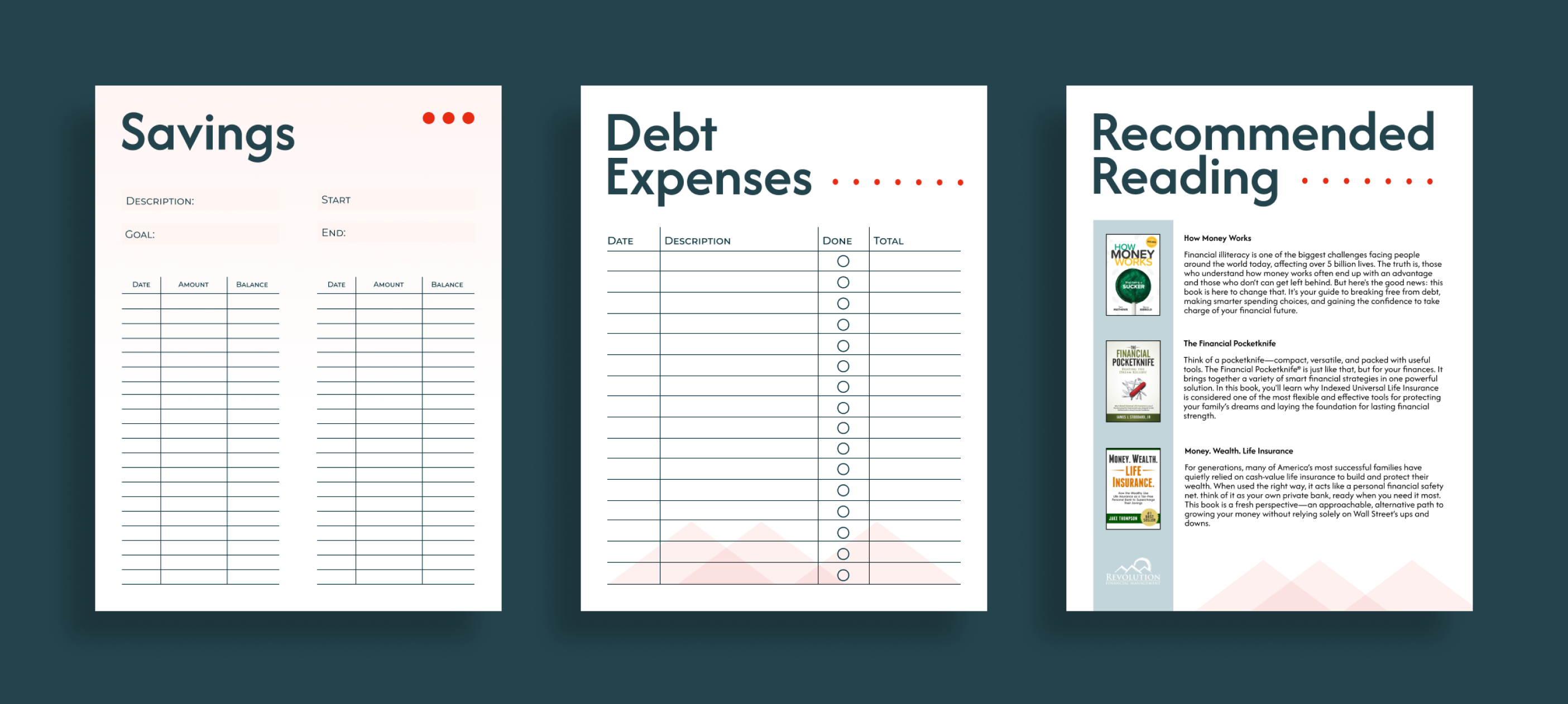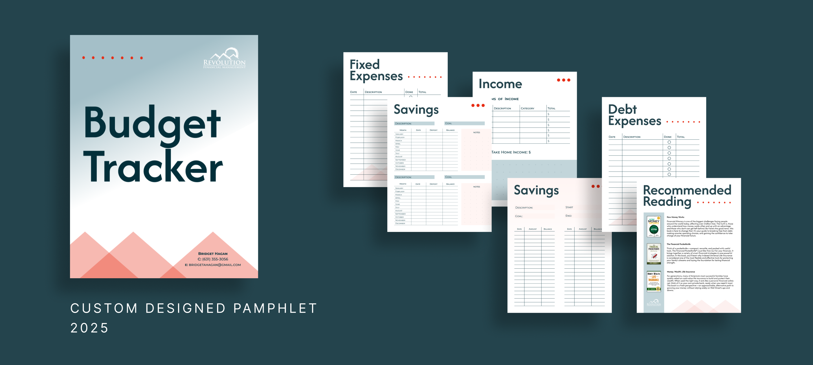 Revolution Financial Management needed a custom budget tracker pamphlet to provide clients with a clear, organized way to manage their personal finances. My role was to design a tool that was not only highly functional but also aligned seamlessly with the company’s established brand identity. The objectives were to create a branded financial tool that reflects professionalism and trust, provide easy-to-use layouts for tracking income, expenses, debt, and savings and design a resource that feels personalized, approachable, and client-centered.